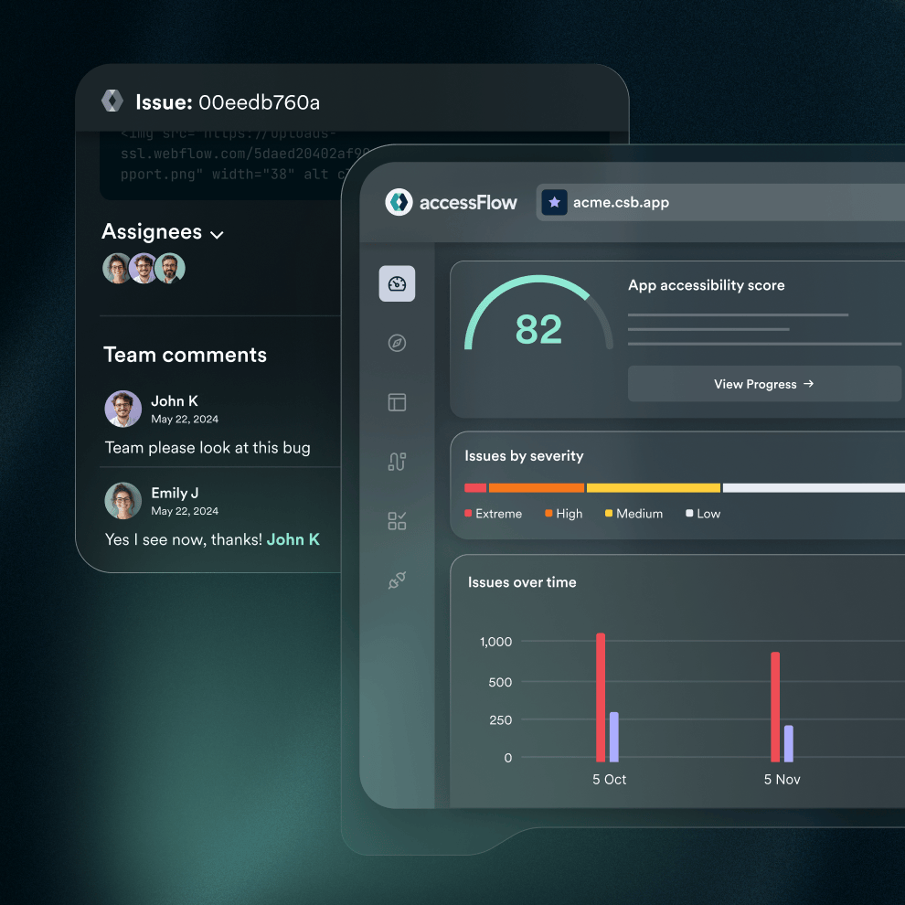 Code-level complianceaccessFlow equips your dev team with tools to detect, prioritize, and resolve accessibility issues at any stage of your development pipeline. Integrated into your SDLC, it automates error detection, task management, and code-level remediation for efficient, compliant development.