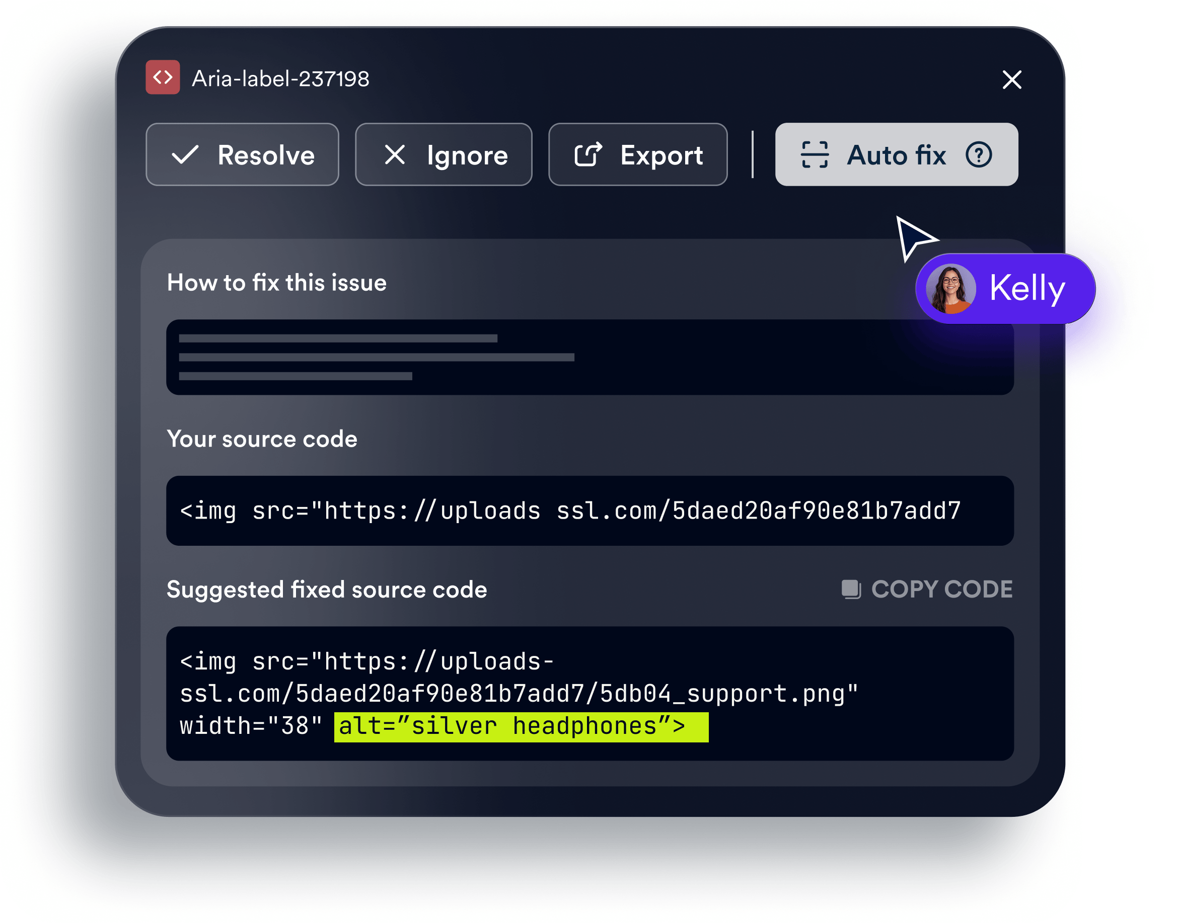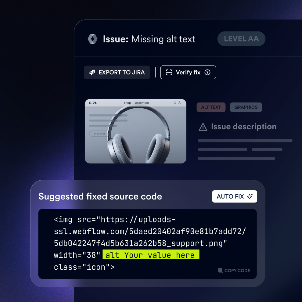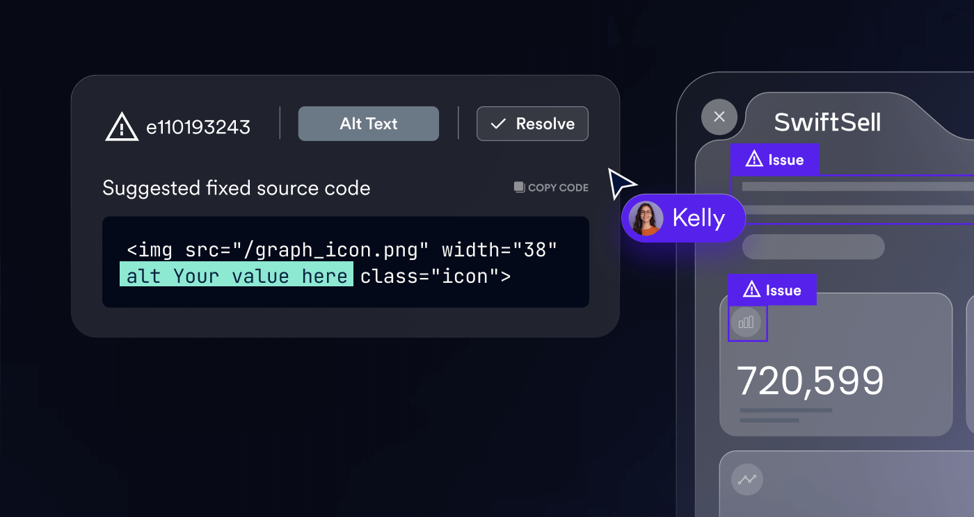 Receive customized, ready-to-implement code fixes with visual highlights, WCAG-based guidance, and clear examples to resolve accessibility issues faster and more accurately