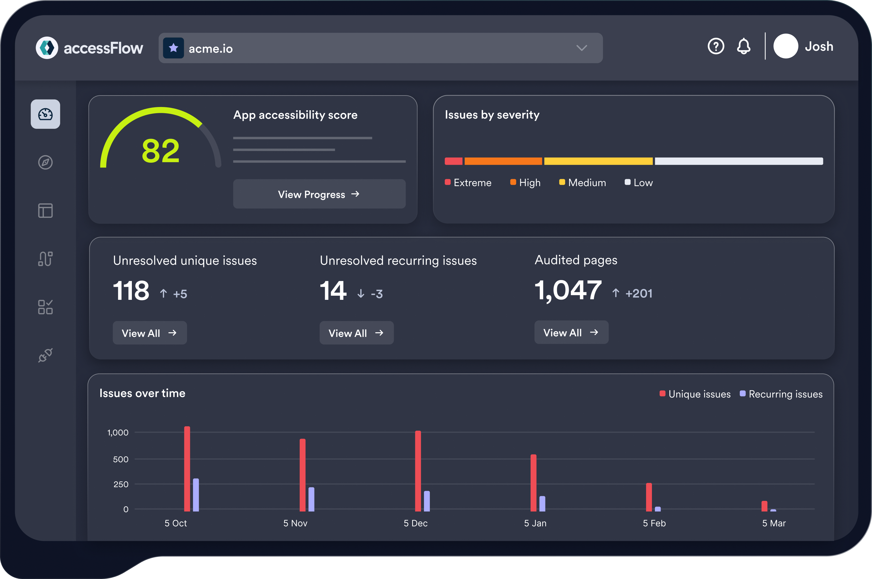 Actionable insights, trend analysis, and task prioritization help dev assess accessibility status, identify urgent fixes, and implement solutions