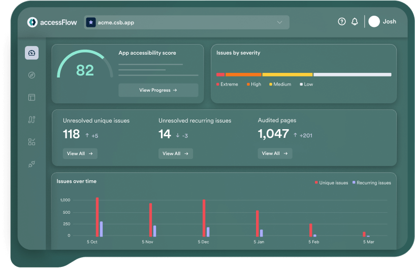 Track, manage, and address accessibility issues from a centralized dashboard. Assign tasks, prioritize fixes, and identify recurring patterns across projects to keep your team focused and efficient.